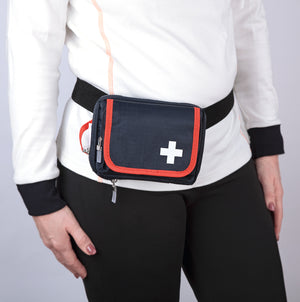 First aid kit prepared for emergencies - even on the road. Robust nylon bag with 27-piece first aid set. Can be attached to the belt with Velcro. Inner pockets with clever organization system, additional pocket on the front for personal medication. With brochure, especially for leisure accidents.